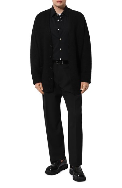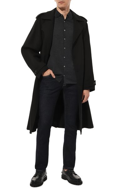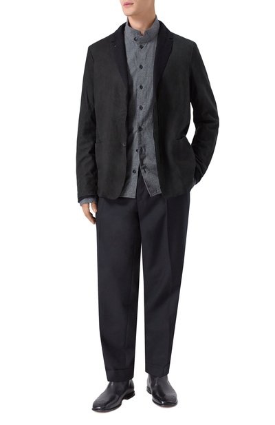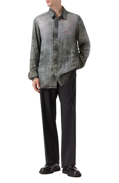 Рубашку на кнопках можно носить как самостоятельно, так и в качестве легкой куртки. Модель с декоративными заломами и короткой бахромой на воротнике-стойке выполнена из денима Fix на основе хлопка с добавлением лиоцелла и модала.