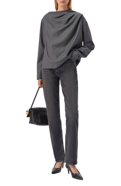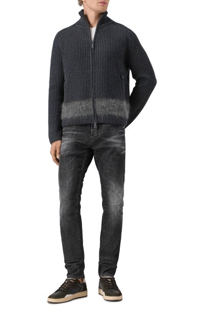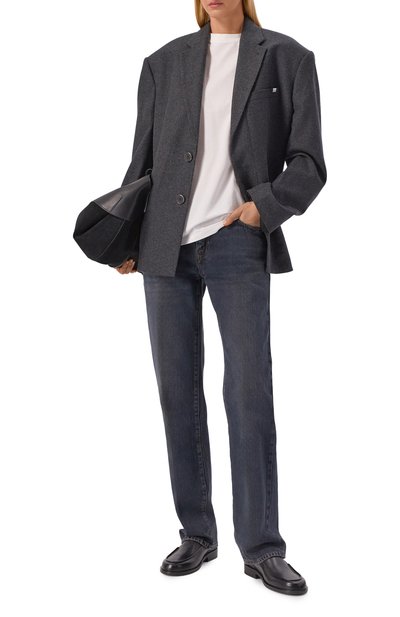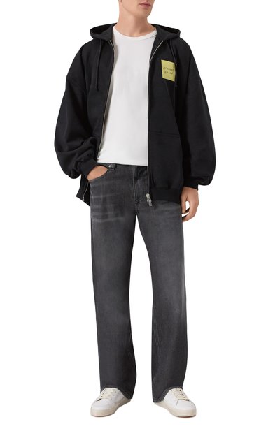 Широкие джинсы 2001 D-Macro с пятью карманами выполнили из денима с добавлением лиоцелла и модала. Чтобы придать модели с брендированными патчами на поясе и сбоку состаренный вид, ее выбелили, постирали с камнями и покрыли прозрачной пленкой.
