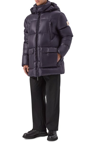 Стеганую куртку W-choco на утином пуху выполнили из облегченного нейлона. Модель с регулируемыми кулисками на манжетах и по низу дополнили капюшоном, скрытым в воротнике-стойке. Левый рукав украсили фирменной эмблемой Oval D.
