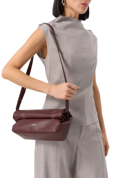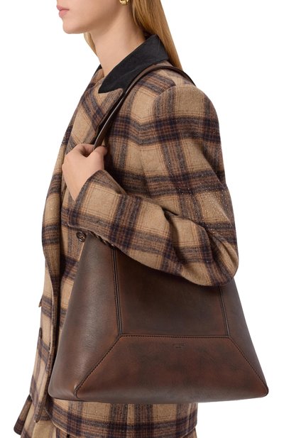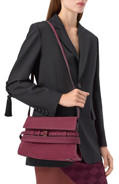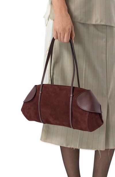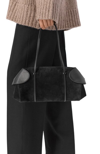 Сумку Berenices East West выполнили в технике лазерной резки из телячьей кожи и замши, сертифицированных REACH и LWG. Аксессуар с двумя длинными ручками и плоским внутренним карманом заст егивается магнитными сгибами по бокам и Т-образным замком.
