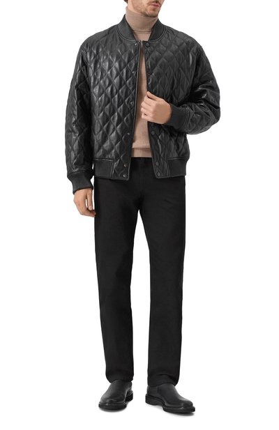 Утепленный бомбер сшили из техно-шелка Zegna. Для манжет, пояса и воротника выбрали ребристый трикотаж в тон. Куртка с врезными боковыми карманами застегивается кнопками.
