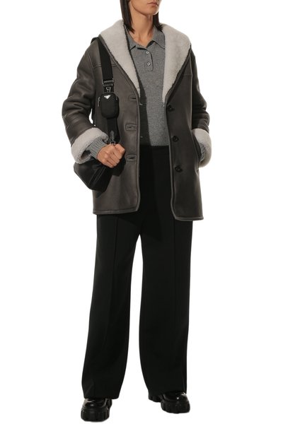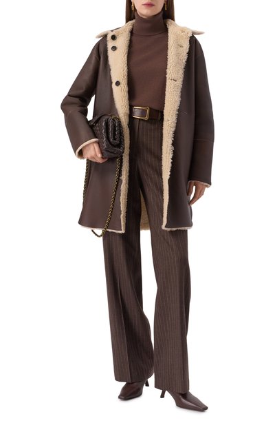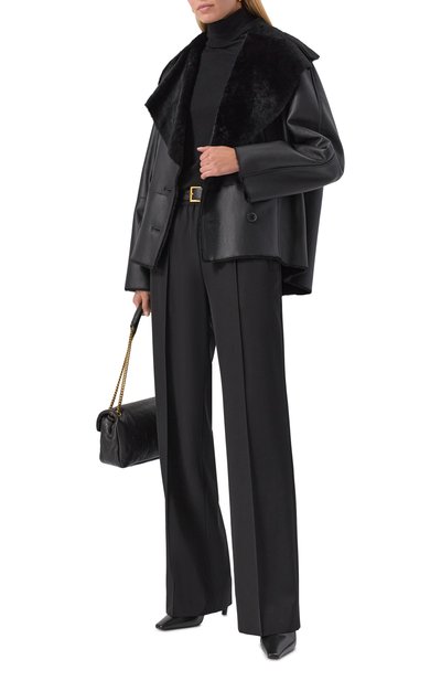 Двубортную дубленку с боковыми карманами, дополненными подкладом из шелкового бархата, изготовили из выделанной вручную овчины испанского ягненка. Для отделки воротника и манжет выбрали мех с длинным витым ворсом.