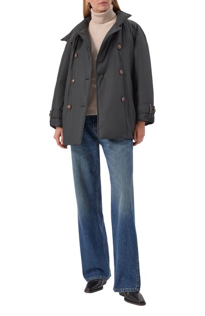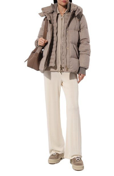 Стеганый пуховик с боковыми карманами сшили из фактурного кашемирового текстиля с добавлением полиэстера, шелка и пайеток. Куртка на гусином пуху застегивается молнией, смещенной вбок, и кнопкой на широком лацкане.