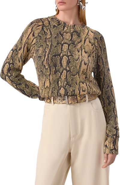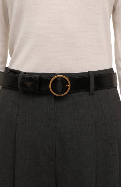 Ремень с леопардовым принтом выполнили из ворсовой шкуры теленка. Аксессуар с тренчиком из такого же материала застегивается латунной пряжкой с выгравированным логотипом.