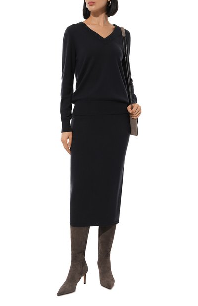 Юбку-карандаш с высокой посадкой выполнили из фактурной шерстяной ткани. Модель со шлицей застегивается потайной молнией сзади.