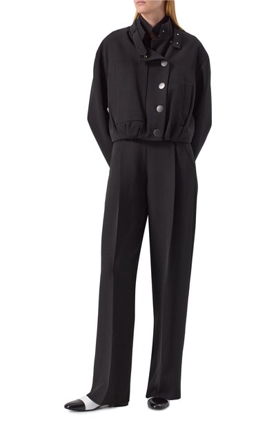 Oversize-бомбер с трикотажными манжетами, поясом и воротником-стойкой выполнили из полиэстерового атласа. Куртка на шелковом подкладе застегивается молнией и кнопками. Модель с двумя карманами с клапанами украсили тисненой эмблемой на драпированном рукаве.