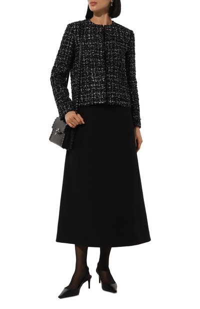 Двубортный жакет с хлястиком на спинке и накладными боковыми карманами сшили из полушерстяного твида. Края укороченной модели подчеркнули однотонным атласным кантом.