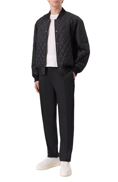Брюки с защипами и стрелками сшили из шерстяного габардина. Модель с лампасами из шелкового атласа дополнили боковыми и задними прорезными карманами.