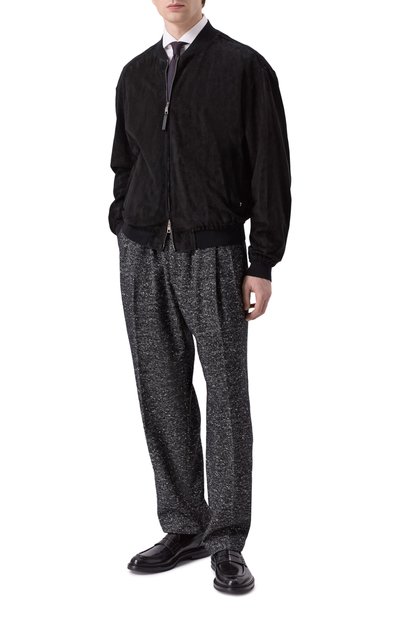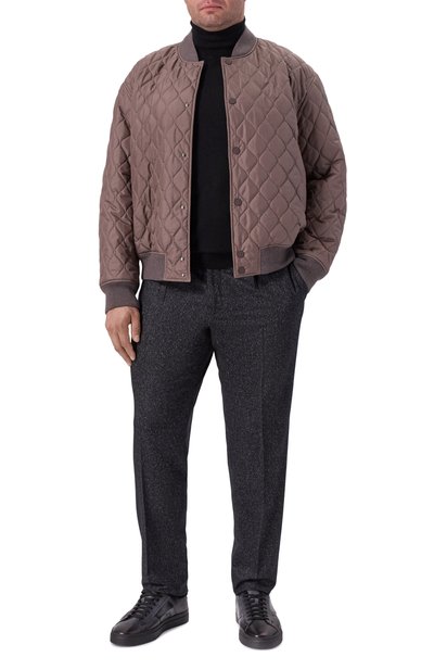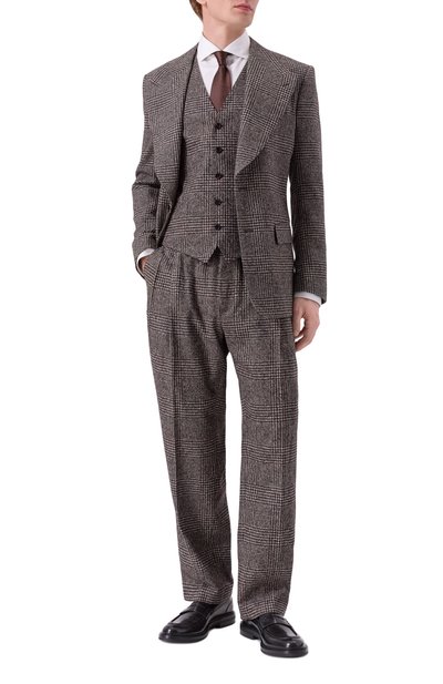 Брюки с шевронным узором выполнили из шерсти с добавлением нейлона. Модель с парными складками на талии дополнили двумя боковыми карманами и парой прорезных сзади.