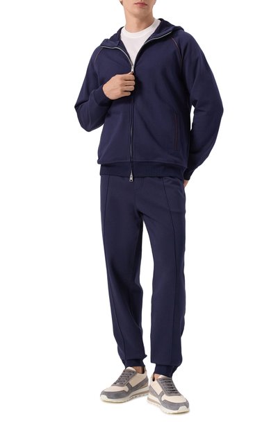 Джоггеры из полиэстера дополнили четырьмя карманами. Посадка модели с потайной молнией и фирменной пуговицей регулируется шнурком, продетым в пояс-кулиску.