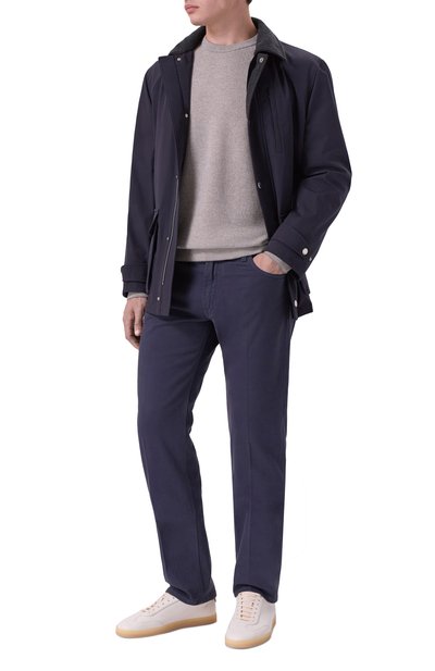 Зауженные джинсы со средней посадкой выполнили из эластичного хлопка с добавлением кашемира. Сзади брюки с пятью карманами украсили брендированным жакроном в тон.