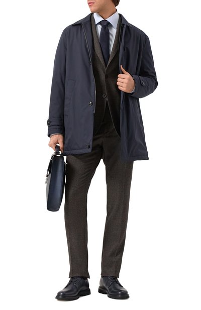 Представленный эксклюзивно в ЦУМе плащ с двумя боковыми, нагрудным и парой внутренних карманов выполнили из полиэстера. Двустороннюю модель с отложным воротником можно носить подкладом из микса шерсти и кашемира наружу.