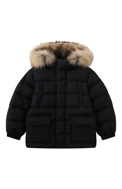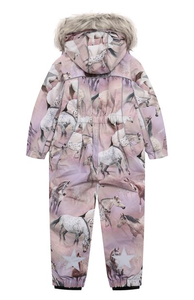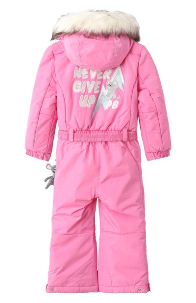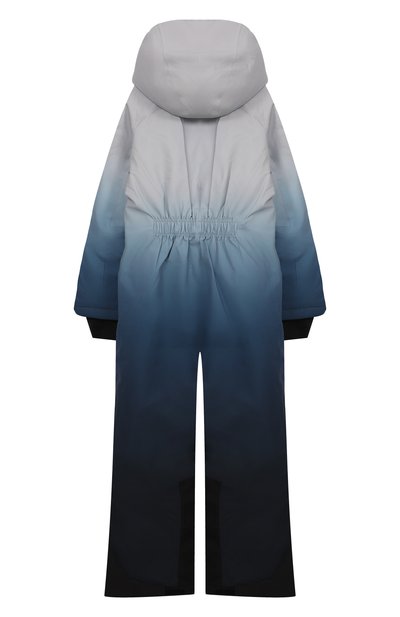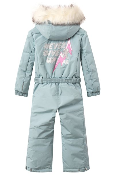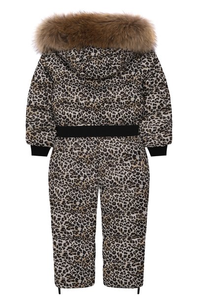 Стеганый комбинезон на утином пуху изготовили из нейлона. Сама модель с меховой отделкой на капюшоне, разрезы на брючинах и четыре кармана застегиваются молниями. Изделие с трикотажными манжетами дополнили эластичным поясом с пряжкой фастекс.