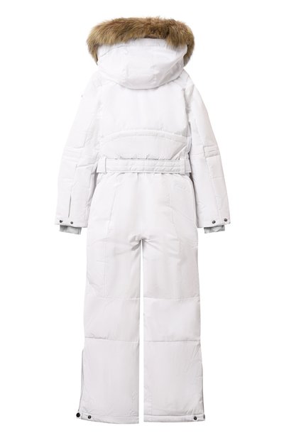 Стеганый комбинезон из ветро- и влагостойкого полиэстера утеплили утиным пухом. Модель с трикотажными манжетами, четырьмя карманами и молниями внизу брючин дополнили эластичным поясом с пряжкой фастекс. Меховую отделку на капюшоне можно отстегнуть.
