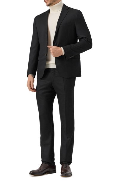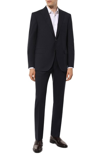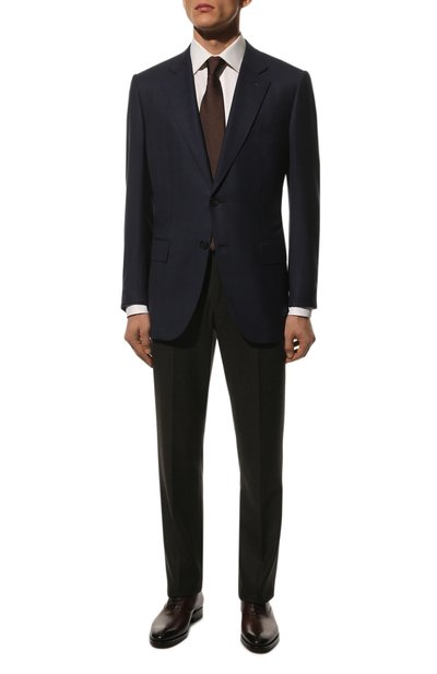 Оксфорды выполнили из цельного отреза гладкой кожи, отполировав готовую пару до глянцевого блеска. Модель с миндалевидным мысом установили на резиновую подошву и наборный каблук.
