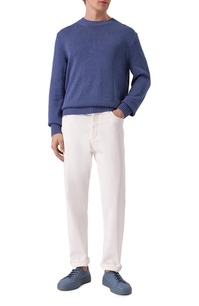 Свитер со спущенной линией плеч связали фактурным узором плотностью три петли на дюйм из пряжи на основе шерсти первого пострига. Модель с рельефными швами дополнили молнией на высокой горловине.