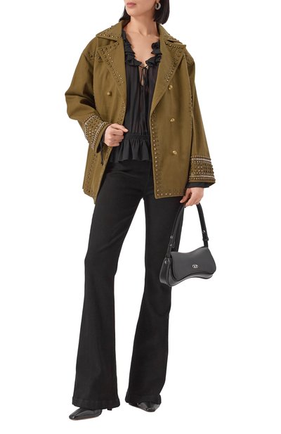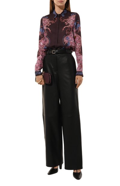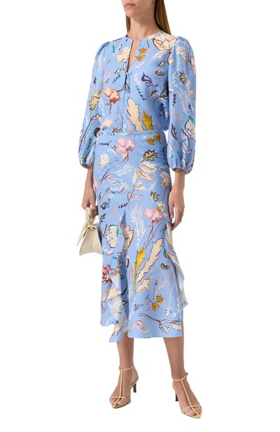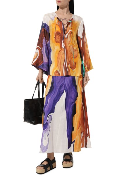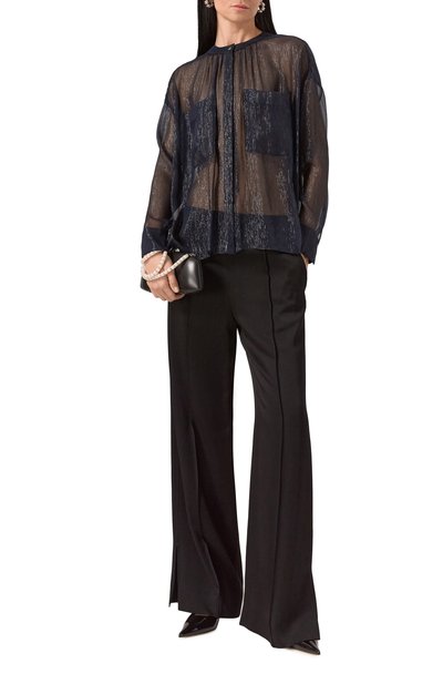 Блузу Tamela свободного кроя выполнили из полупрозрачного вискозного шифона с принтом в виде лошадей. Драпированную модель с объемными рукавами дополнили шнуровкой на глубоком V-образном вырезе.
