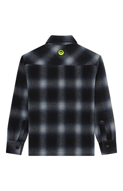 Клетчатую рубашку с фирменным ярлыком снизу сшили из микса акрила, полиэстера и шерсти. Левый нагрудный карман украсили логотипом, а спинку – знаковым эмодзи, которому вторит одна из кнопок.