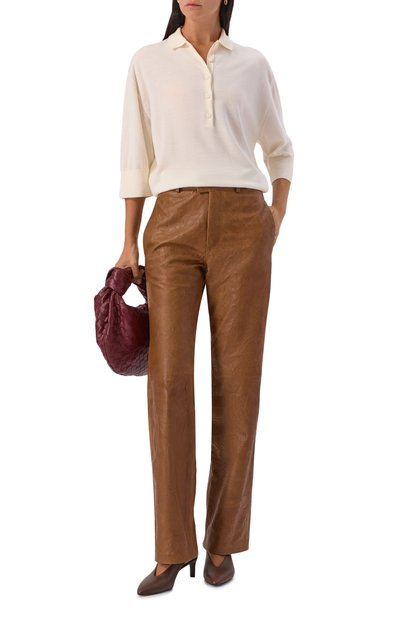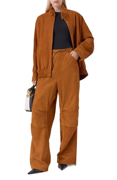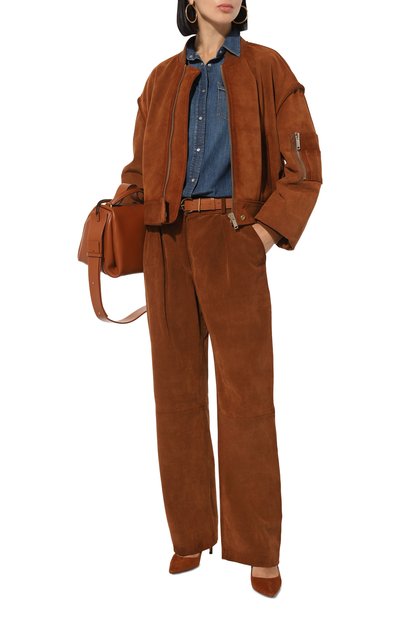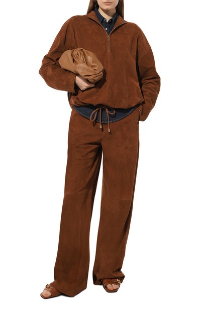 Брюки со шлевками на поясе дополнили пятью карманами. Для изготовления модели прямого кроя использовали тонко выделанную вручную замшу оттенка Bran.