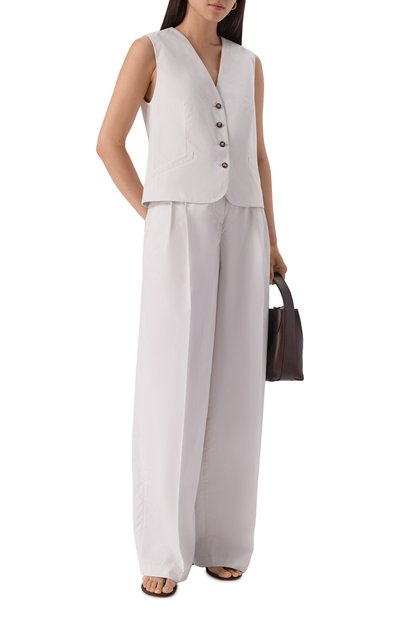 Меланжевые брюки Taflong со средней посадкой и поясом со шлевками сшили из эластичной фланели с добавлением шерсти. Модель с защипами и стрелками дополнили четырьмя врезными карманами.