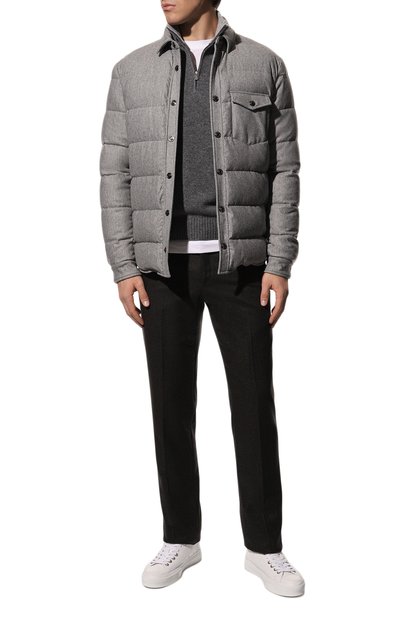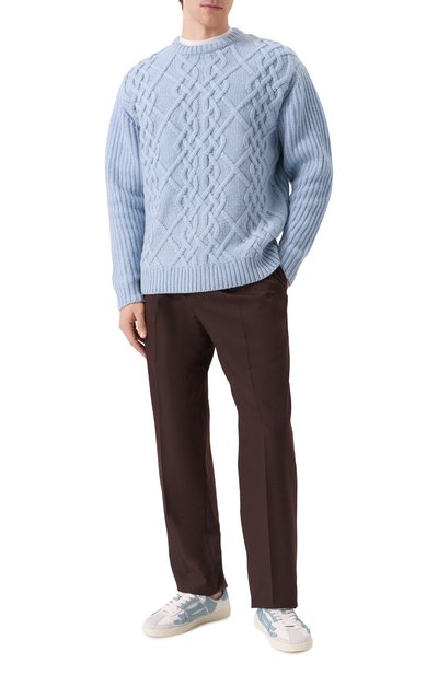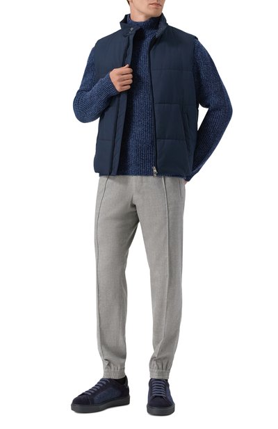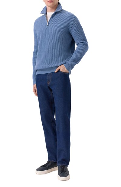 Свитер Kobear с высоким воротником, контрастными манжетами и поясом в рубчик выполнили из эластичной шерстяной пряжи, укрепленной полиамидом. Модель со спущенной линией плеч застегивается молнией.