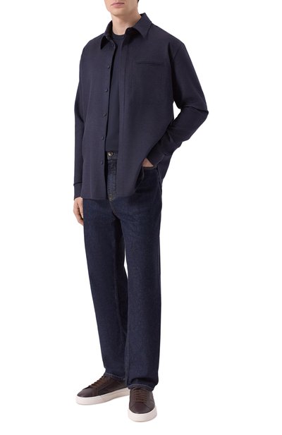 Рубашку с рельефными швами и кокеткой на спинке выполнили из кашемира. Модель с прямоугольными манжетами дополнили нагрудными карманами с клапанами.