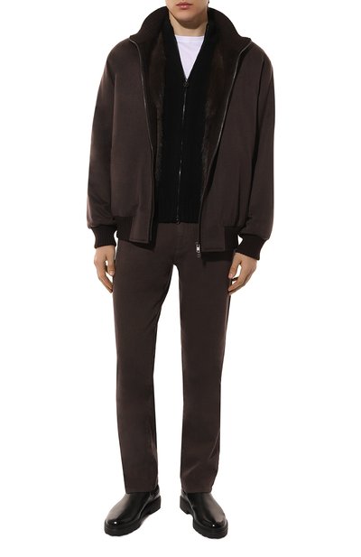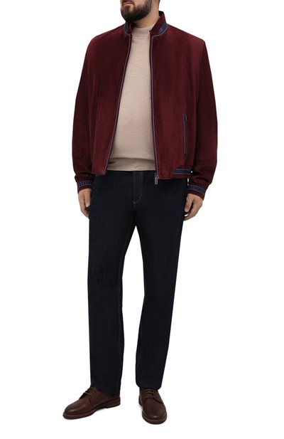 Бомбер с поясом, воротом и манжетами из трикотажа в рубчик дополнили боковыми карманами. Модель из зернистой кожи застегивается встречной молнией с брендированным пуллерами фирменного алого оттенка.