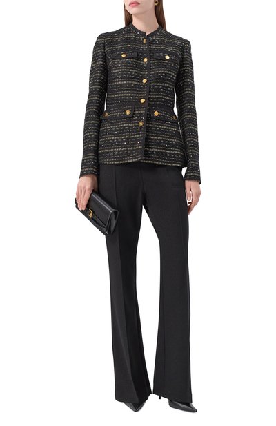 Для пошива брюк с высокой посадкой и поясом со шлевками использовали эластичный бархат из хлопка и вискозы. Расклешенную модель дополнили двумя парами врезных карманов.