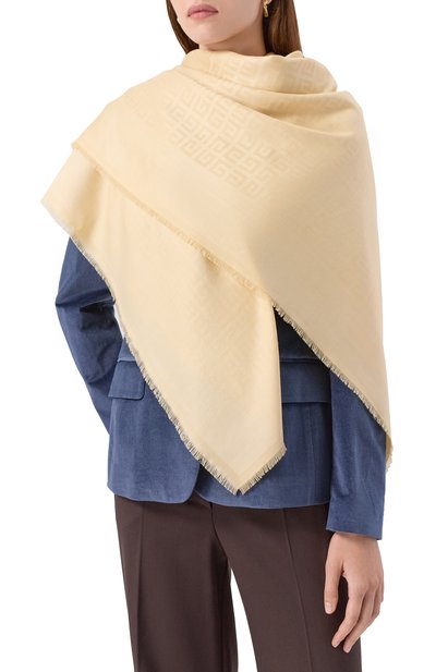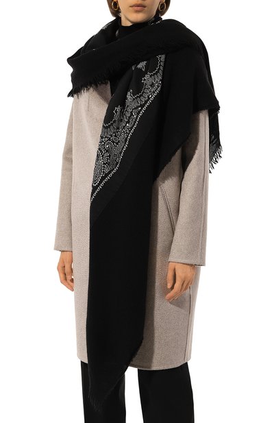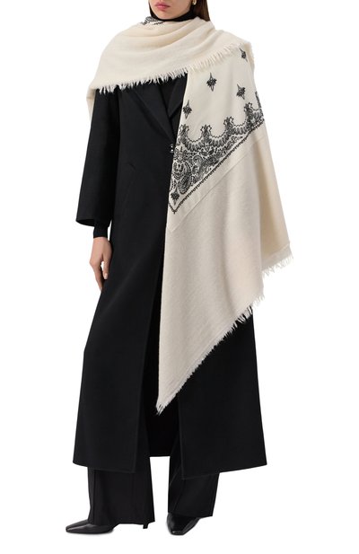 Палантин с бахромой по краям выполнили из смеси вискозы и льна с добавлением полиэстера и металлизированных нитей. Модель дополнили миниатюрной фирменной звездой.