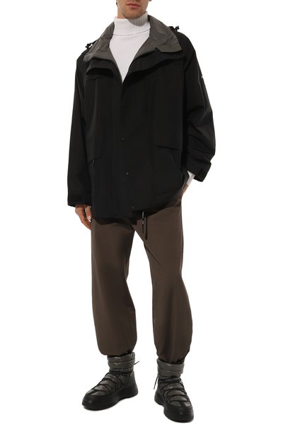 Куртку с наполнителем Primaloft выполнили из кашемира с обработкой Storm System®, изготовленного на мануфактуре Loro Piana. Воротник-стойку сзади украсили эмблемой Shark fin. Модель со съемным регулируемым капюшоном, внутренним и тремя внешними карманами застегивается молнией, скрытой под штормовой кнопочной планкой.