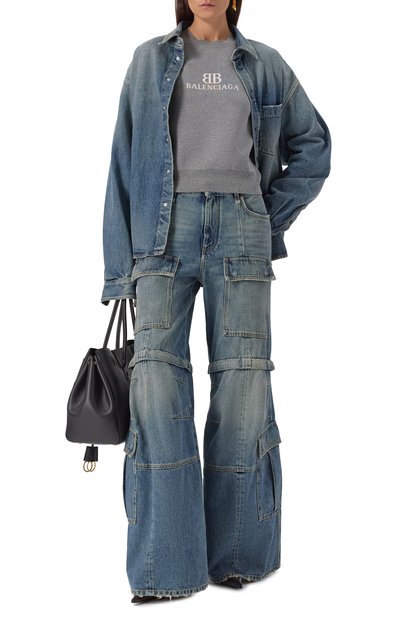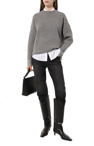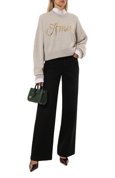 Свитер с широкими горловиной, поясом и манжетами в рубчик выполнили из шерстяной пряжи. Спереди модель со спущенной линией плеч украсили контрастным логотипом, связанным в технике интарсии.
