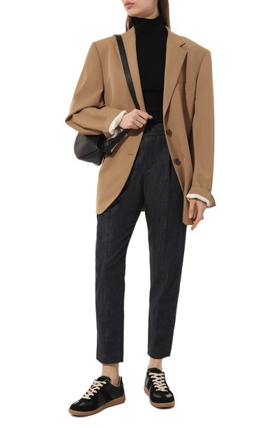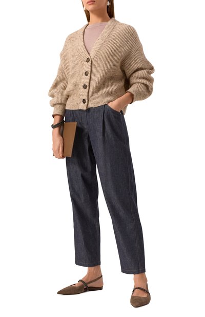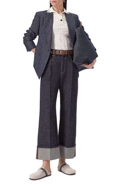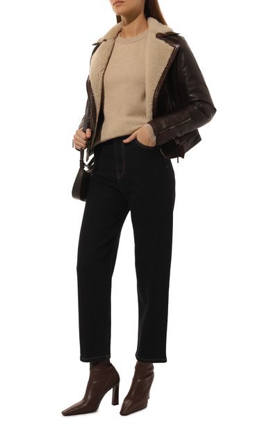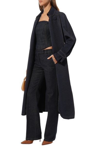Прямые джинсы со средней посадкой выполнили из неэластичного хлопка. Брюки с пятью карманами и V-образной кокеткой украсили фирменным жакроном на поясе сзади.