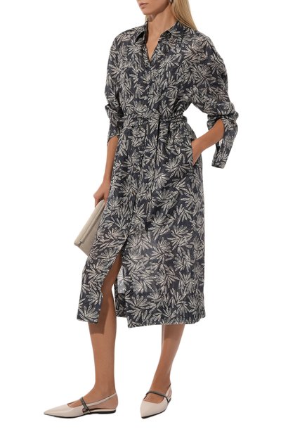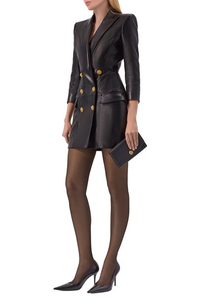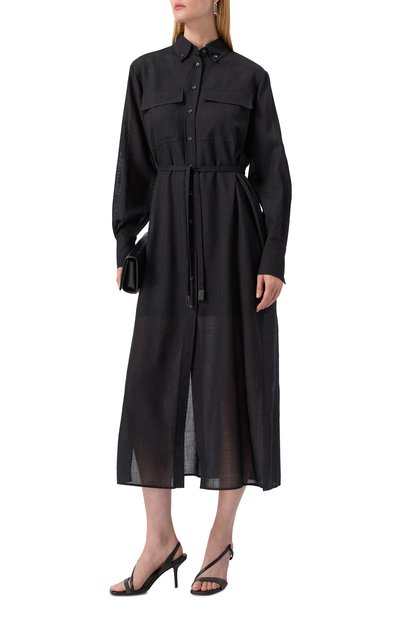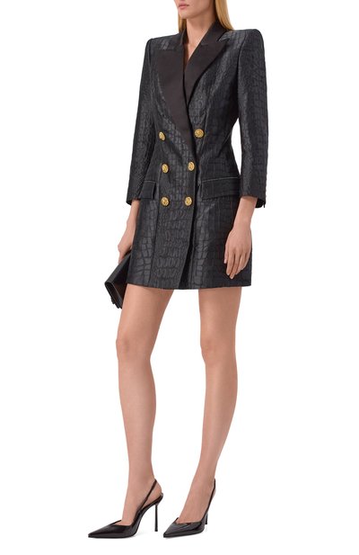 Двубортное платье-жакет с заостренными лацканами изготовили из костюмной шерсти. Модель с тремя прорезными карманами украсили рядами цепочек мониль по краям манжет. В комплекте – платок в тон.