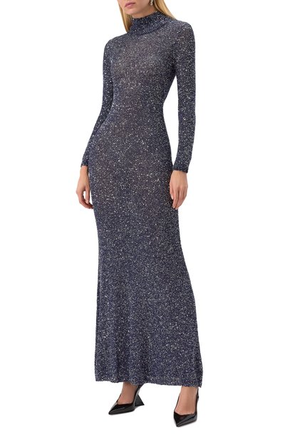 Двубортное платье-жакет с заостренными лацканами изготовили из костюмной шерсти. Модель с тремя прорезными карманами украсили рядами цепочек мониль по краям манжет. В комплекте – платок в тон.