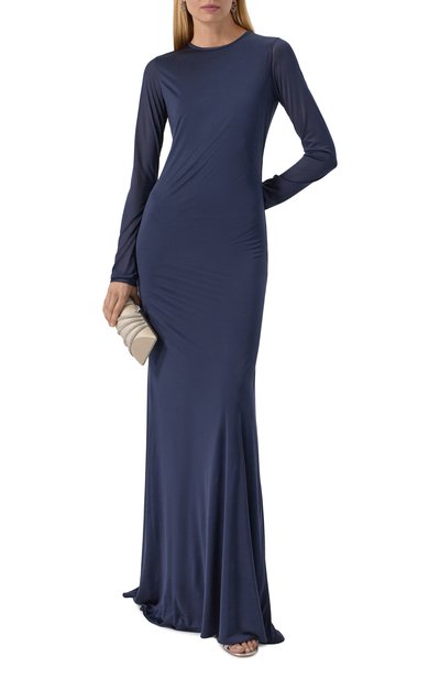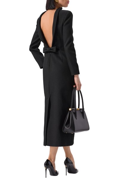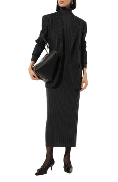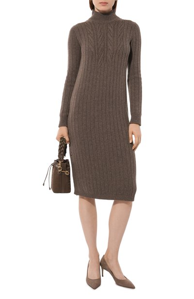 Миди-платье в рельефную вертикальную полоску выполнили из трикотажа на основе шерсти первого пострига. V-образную горловину выполнили в более тонкий рубчик, подчеркнув такой же вязкой талию.
