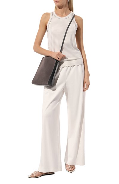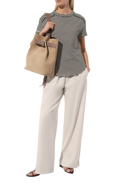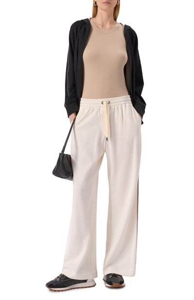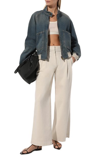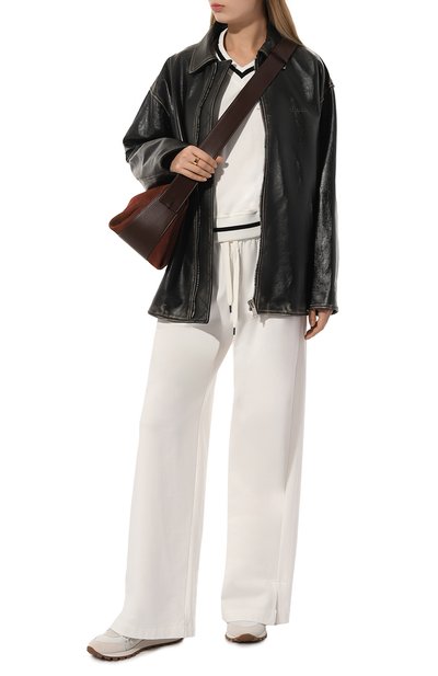 Брюки с пятью карманами изготовили из хлопкового вельвета. Модель украсили кожаным брендированным патчем на поясе и цепочкой мониль на шлевке сзади.