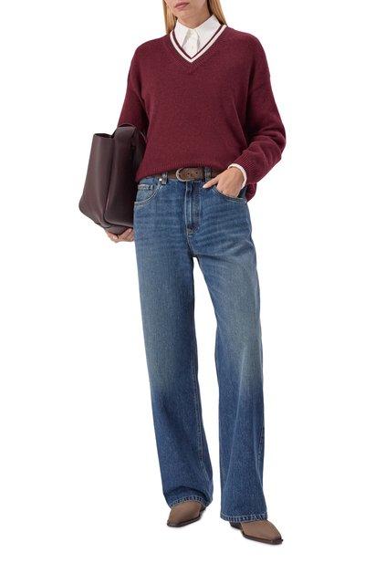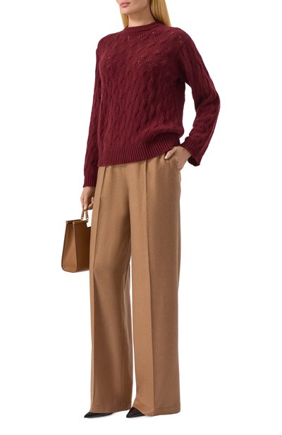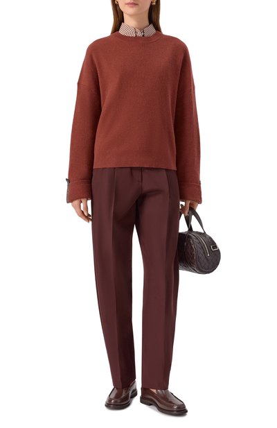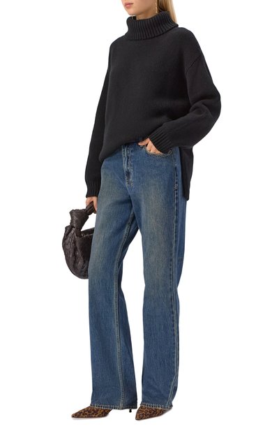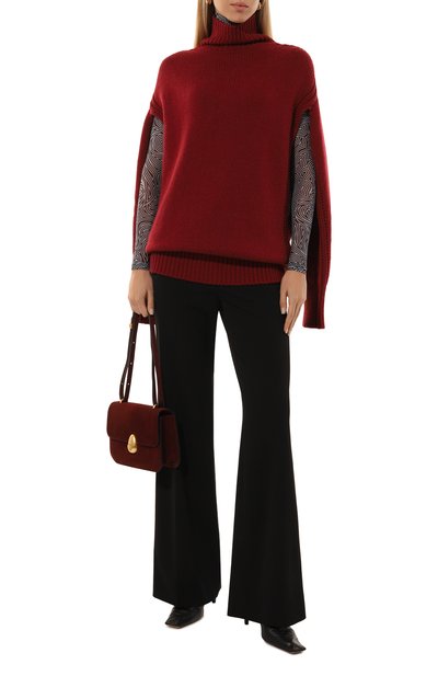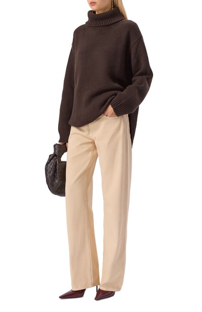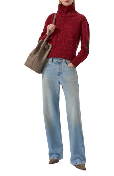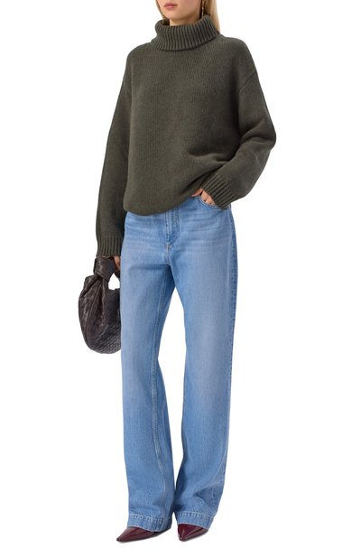 Свитер со спущенной линией плеч связали из кашемировой пряжи. Высокую горловину подчеркнули фирменной цепочкой мониль сзади, а ребристые манжеты и пояс оставили без декора.