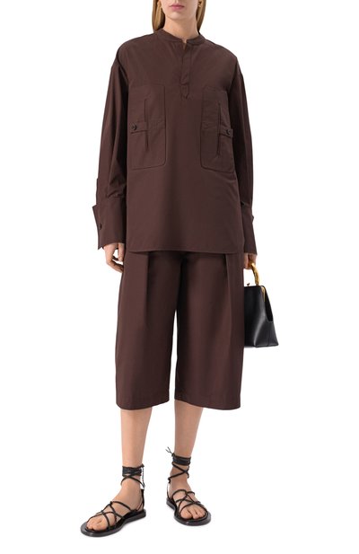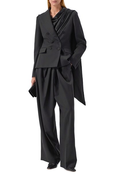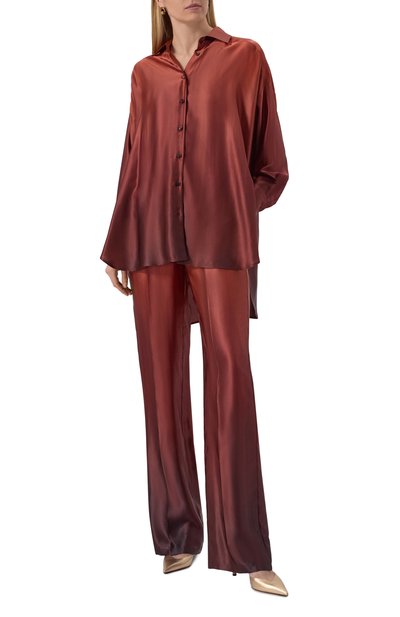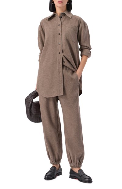 Джоггеры с эластичными манжетами на кнопках и поясом выполнили из атласного шелкового шармеза. Модель с двумя парами карманов дополнили боковыми молниями.