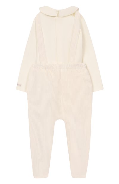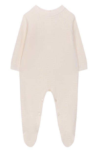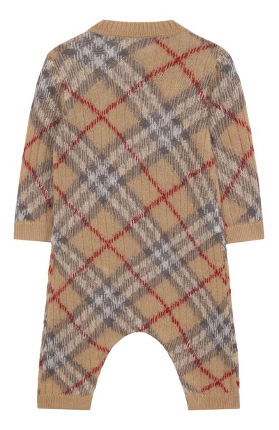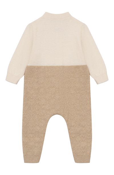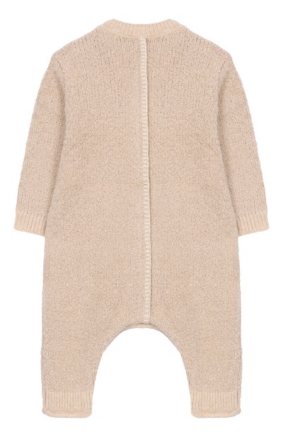 В коллекцию Newborn вошел комбинезон из кашемирового трикотажа. Модель с круглой горловиной, поясом и манжетами в рубчик застегивается пуговицами на рукавах реглан и шаговом шве. Жаккардовое изображение медвежонка Bernie спереди дополнили монограммой BC.
