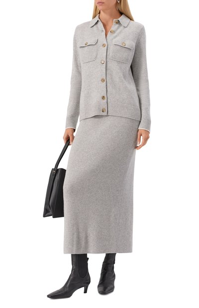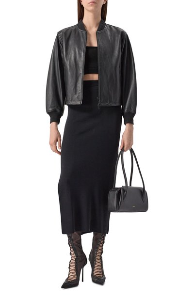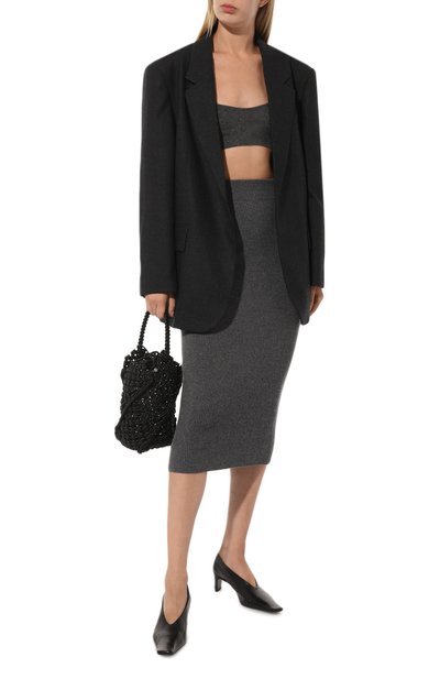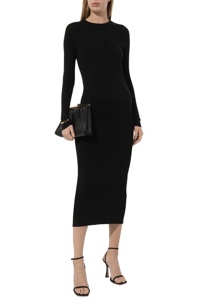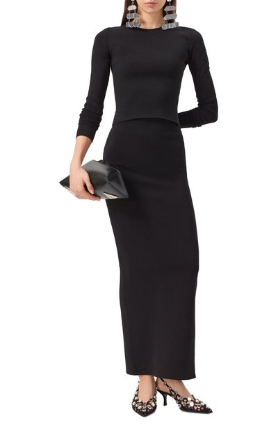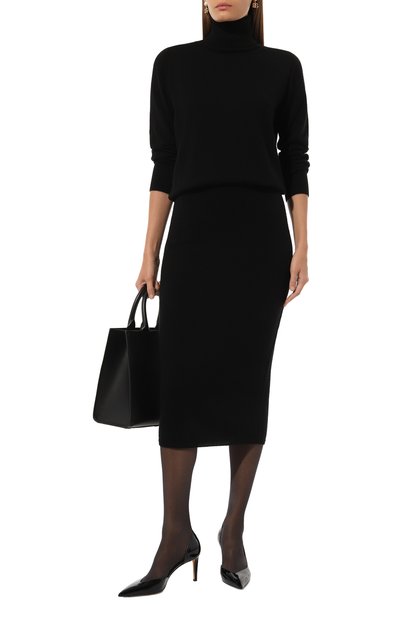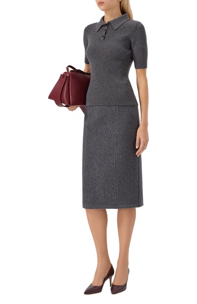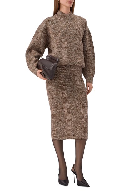 Облегающую юбку связали из ворсованной эластичной пряжи на основе kid-мохера и полиамида. Модель застегивается потайной боковой молнией.