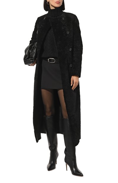 Однобортное приталенное пальто с потайной застежкой выполнили из шерстяной ткани с добавлением полиэстера. Модель с широкими лацканами, высокой шлицей и врезными боковыми карманами декорировали крупными кристалл ами по всей поверхности.