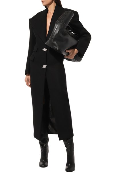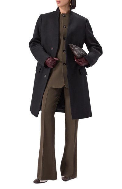 Однобортное приталенное пальто с потайной застежкой выполнили из шерстяной ткани с добавлением полиэстера. Модель с широкими лацканами, высокой шлицей и врезными боковыми карманами декорировали крупными кристаллами по всей поверхности.