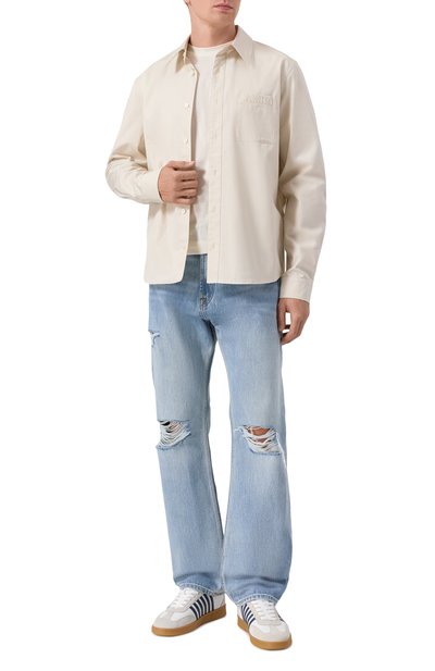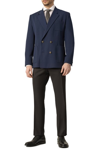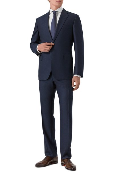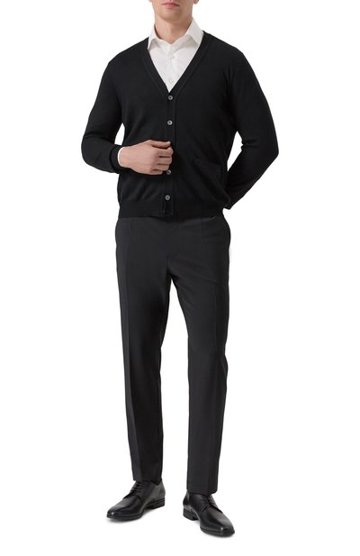 Сорочку с плиссированной манишкой и воротником «бабочка» выполнили из хлопкового поплина. Сама модель застегивается перламутровыми пуговицами, а венские манжеты – входящими в комплект запонками в форме узла.