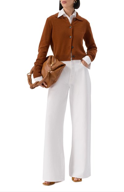 Кардиган, словно окутанный полупрозрачным тюлем, связали из шерстяной пряжи. Модель с отделкой в рубчик и брендированным патчем на спинке застегивается пуговицами.