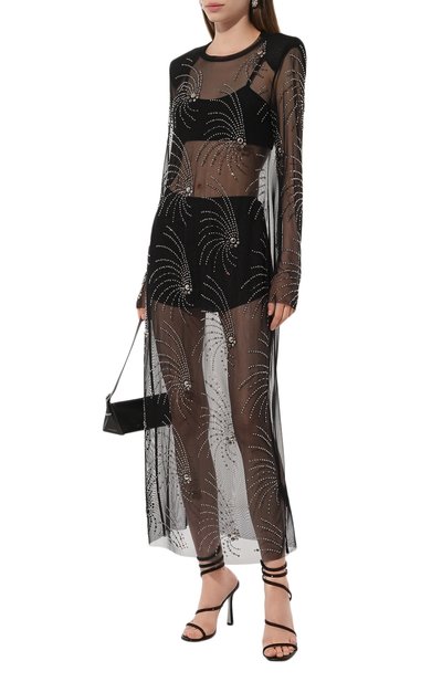 Длинное платье с манжетами-митенками и воротником-стойкой выполнили из стрейчевого цветочного кружева на основе полиамида. Встречная молния по всей длине спереди позволяет отрегулировать глубину декольте и разреза на подоле.