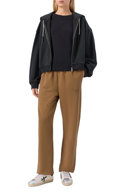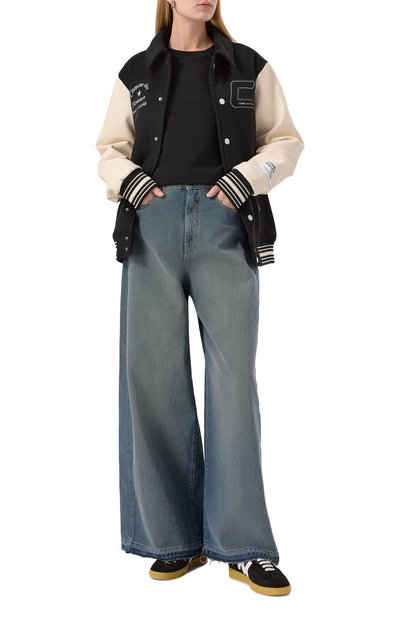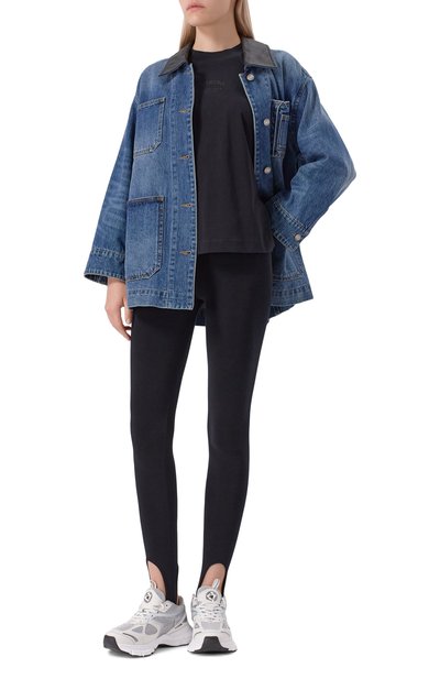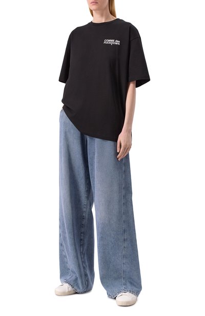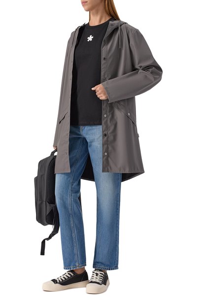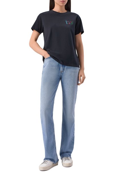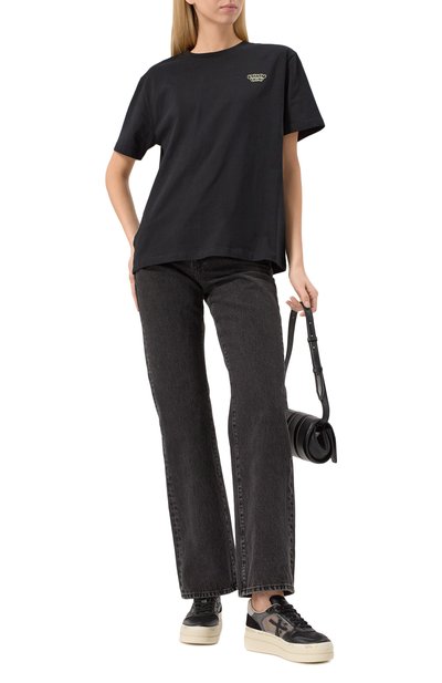 Свободную футболку с короткой молнией на высоком воротнике и спущенной линией плеч выполнили из хлопка. Спереди модель украсили контрастным брендированным принтом.
