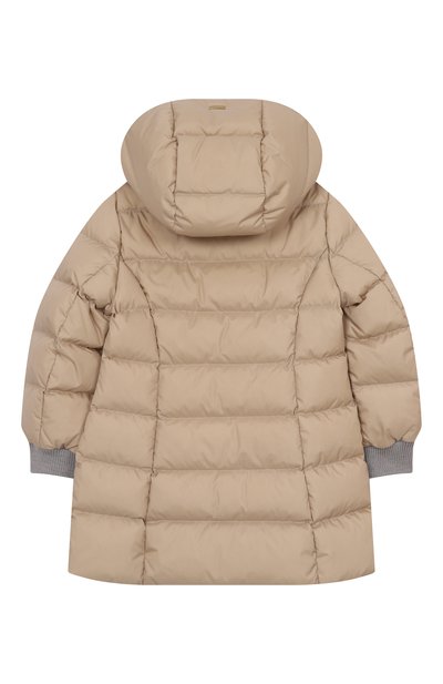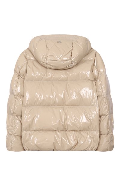 Стеганую куртку на гусином пуху выполнили из ветро- и влагозащитного глянцевого нейлона. Модель с высоким воротом и боковыми карманами дополнили съемным брендированным капюшоном. Пуховик, украшенный металлическим логотипом, застегивается молнией.