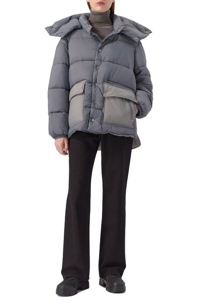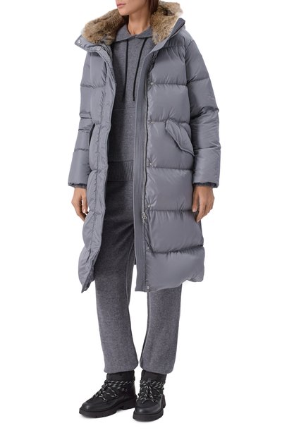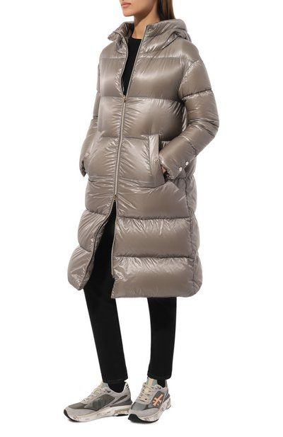 Стеганое пальто на гусином пуху выполнили из матового нейлона. Модель с капюшоном, фигурным низом и боковыми карманами застегивается встречной молнией.