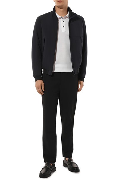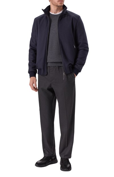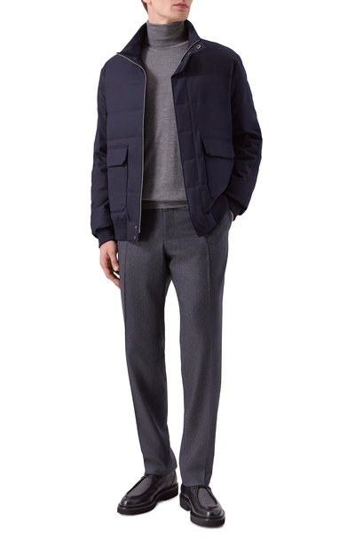 Утепленный бомбер с шевронным мотивом выполнили из шерсти с добавлением кашемира. Воротник-стойку со съемной подкладкой украсили брендированной пластиной сзади. Модель с боковыми карманами застегивается встречной молнией.