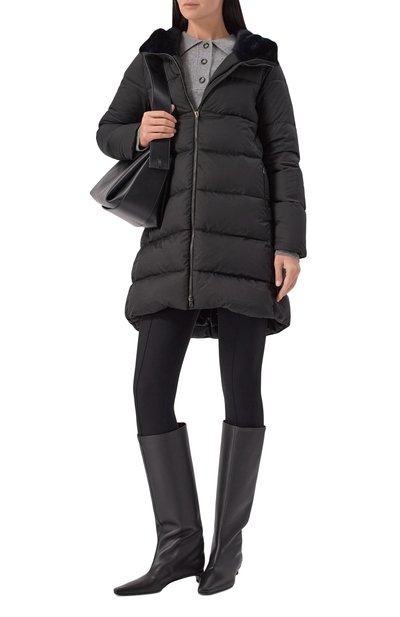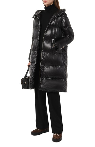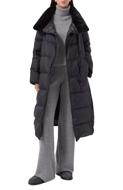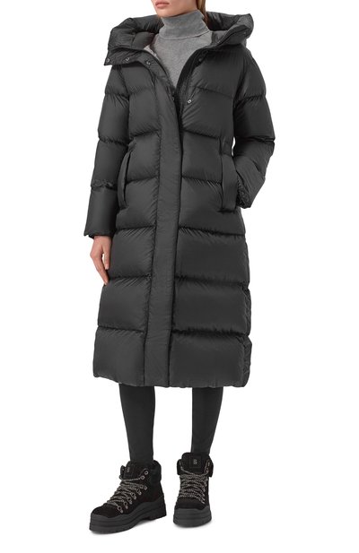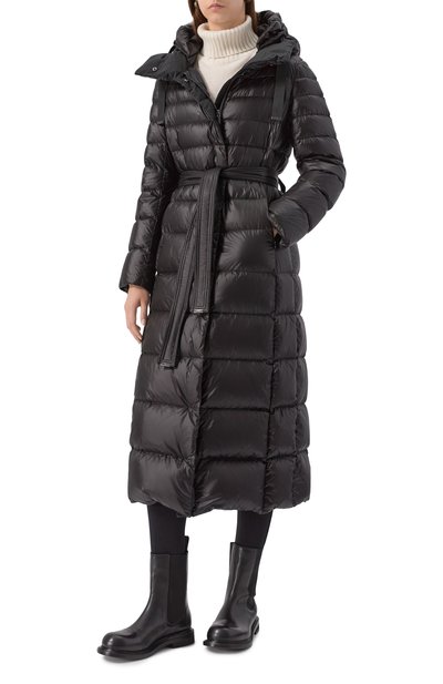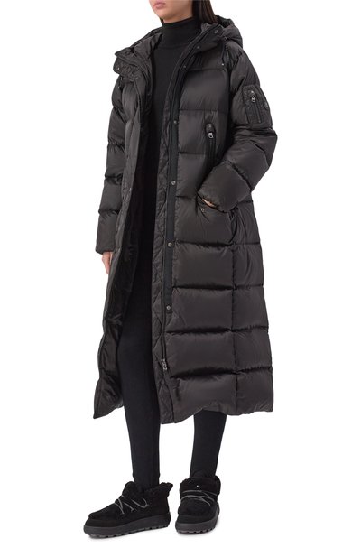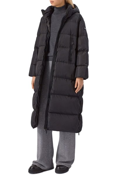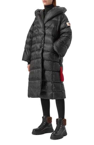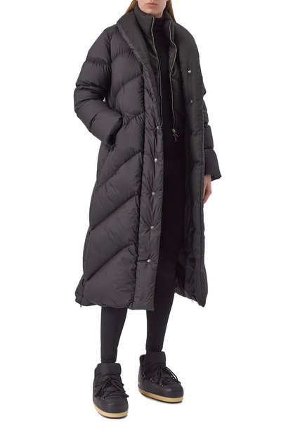 Стеганый пуховик с воротником-стойкой, съемным регулируемым капюшоном и двумя врезными карманами сшили из глянцевого нейлона. Рукава, как и сама удлиненная модель на гусином пуху, застегиваются молниями.